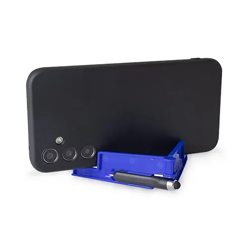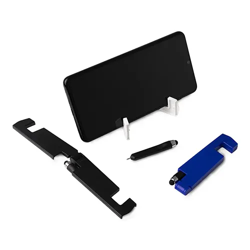 Suporte plástico dobrável para celular, acompanhado de uma mini caneta com ponta touch